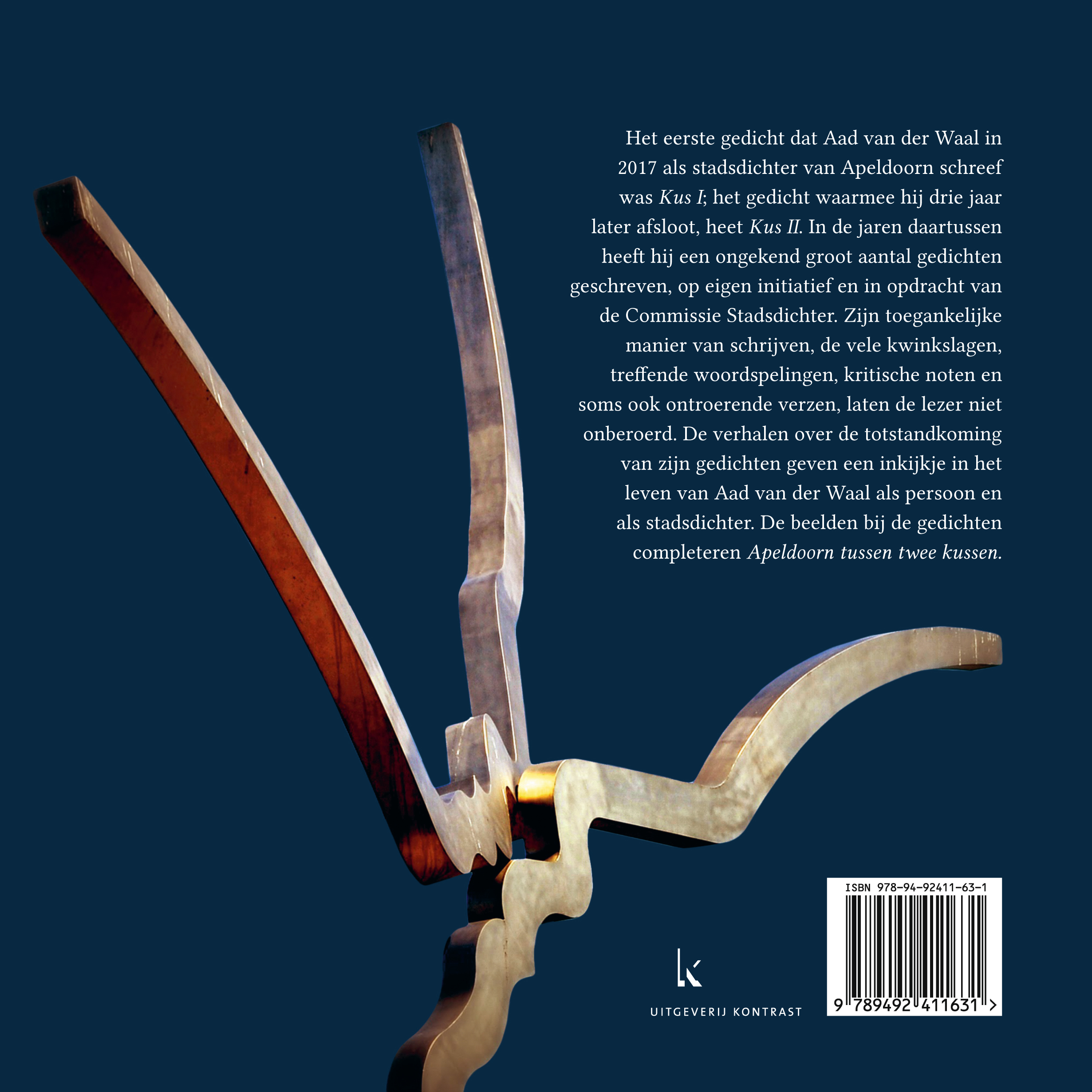 Het eerste gedicht dat Aad van der Waal in 2017 als stadsdichter van Apeldoorn schreef was Kus I; het gedicht waarmee hij drie jaar later afsloot, heet Kus II. In de jaren daartussen heeft hij een ongekend groot aantal gedichten geschreven, op eigen initiatief en in opdracht van de Commissie Stadsdichter. Zijn toegankelijke manier van schrijven, de vele kwinkslagen, treffende woordspelingen, kritische noten en soms ook ontroerende verzen, laten de lezer niet onberoerd. De verhalen over de totstandkoming van zijn gedichten geven een inkijkje in het leven van Aad van der Waal als persoon en als stadsdichter. De beelden bij de gedichten completeren Apeldoorn tussen twee kussen.